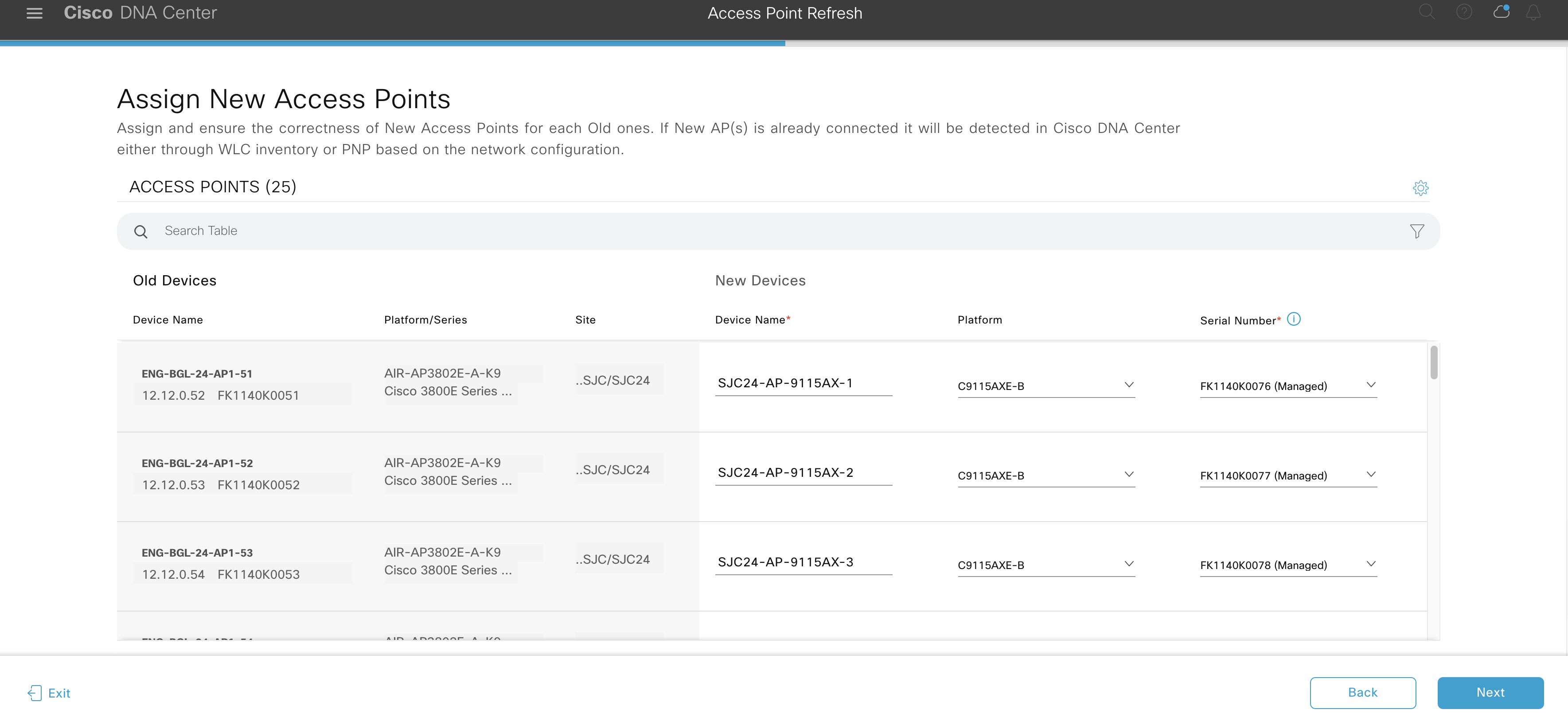 - Then the administrator must provide the serial ID of the replacing (new one) access points against each to-be-replaced (old one) access point. Cisco DNA Center uses this information to verify that the access point used for the replacement is genuine.
