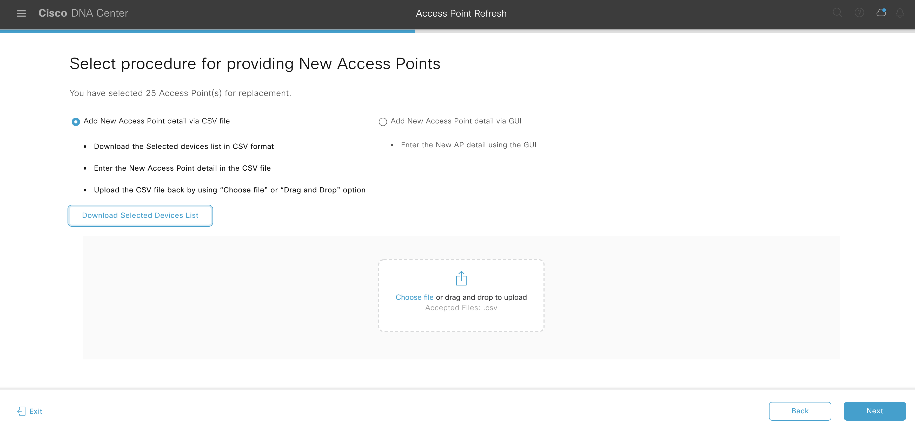 - There is also a CSV template to help the administrator capture the old and new access point information in case of bulk replacement.