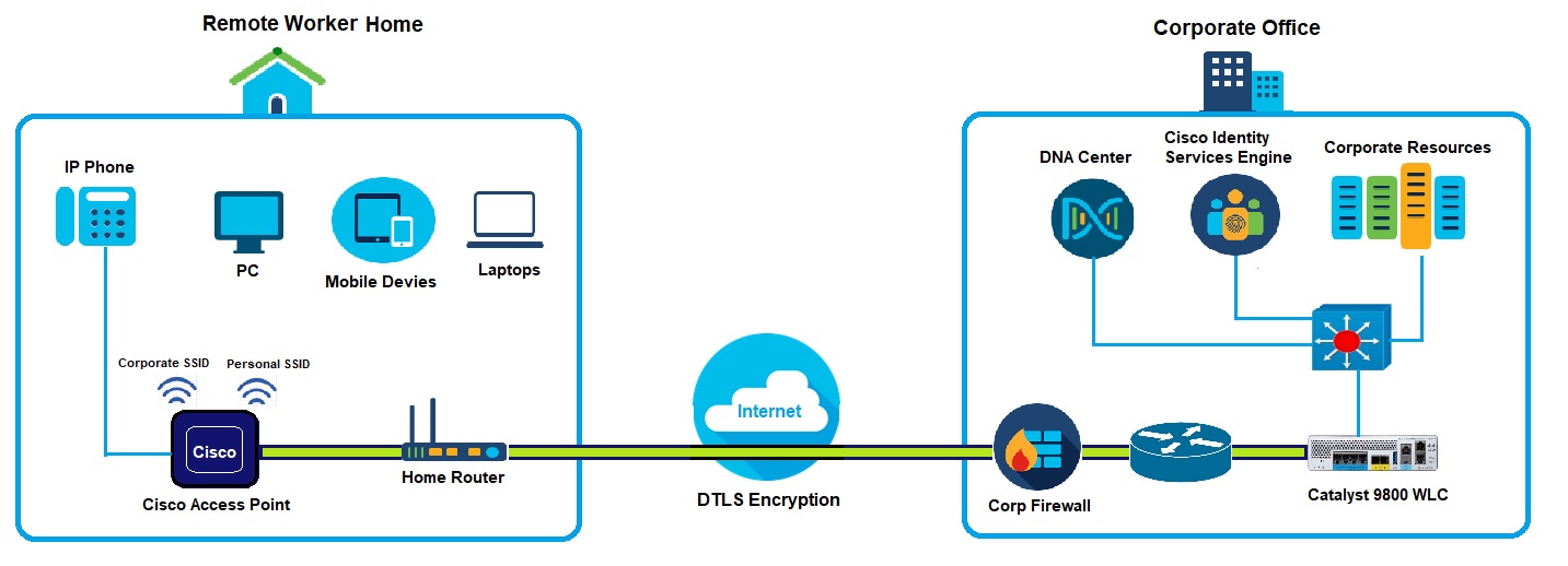 By using the same management, operations, and infrastructure as the corporate WLAN, the solution simplifies the process of extending real-time, high-performance network services to remote locations. Network admins have more control and visibility which helps in troubleshooting any connectivity issues from the remote worker side and gives them the ability to differentiate issues between ISP versus corporate. Admins do not have to define new security policies and the existing Cisco TrustSec policies can be extended to have a more secure network.