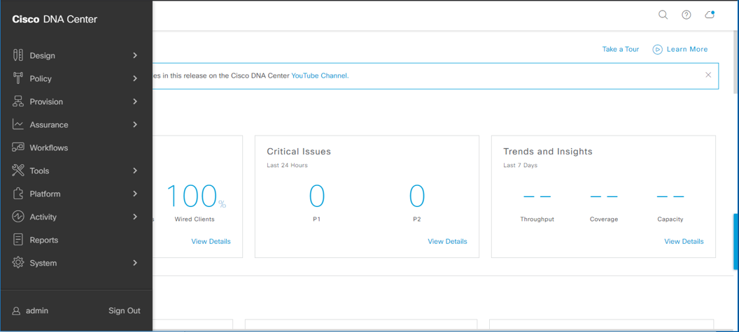 Cisco DNA Center now sports a cleaner interface with a more intuitive menu structure. User navigation is now improved and more intuitive. The dashboard now has a “hamburger” style menu that opens to reveal all top-level choices. Hovering the mouse over each opens detailed options – making screen to screen navigation a breeze. This clean, uncluttered interface makes managing your network from a laptop much easier. Good news for offsite IT teams.