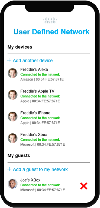 Keep both your users and administrators happy. Free IT from having to deal with endless end-user requests to add, modify, and remove their devices. Give them the freedom to control their own secure partition. Cisco User Defined Network slices the network for each end-user. Via a mobile app, end-users can securely and easily register, remove, or share their devices.
