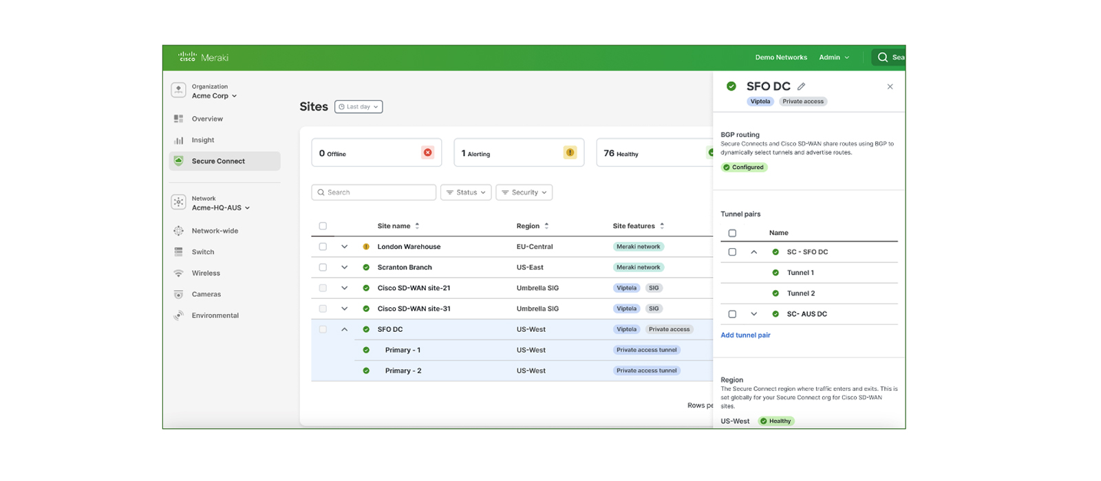 The quality of experience for the workforce is managed from the Cisco+ Secure Connect unified dashboard that shows both Cisco and Meraki SD-WAN fabrics, as well as the status of the tunnels created from the remote site to Cisco+ Secure Connect in the cloud. IT can also use the dashboard to set up policies in the cloud enforcement point, enabling a much better experience for organizations unifying their SD-WAN and Secure Service Edge (SSE) stacks into a single SASE architecture.