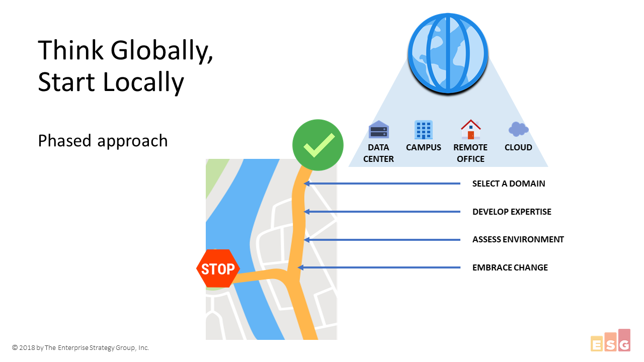Answer: a great first step, to borrow from a well-known phrase, is to “think globally, start locally” and approach IBN in phases. Many readers will already have pieces of your network that are primed for intent-based networking, based on existing investments you have made in SDN.