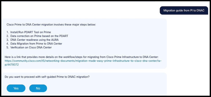 Another example of the cnBOT in action is in response to a query about migrating from the Cisco Prime Infrastructure (PI) to Cisco DNA Center. A high-level migration task list is displayed (Figure 3) with a prompt at the end to do a self-guided migration.