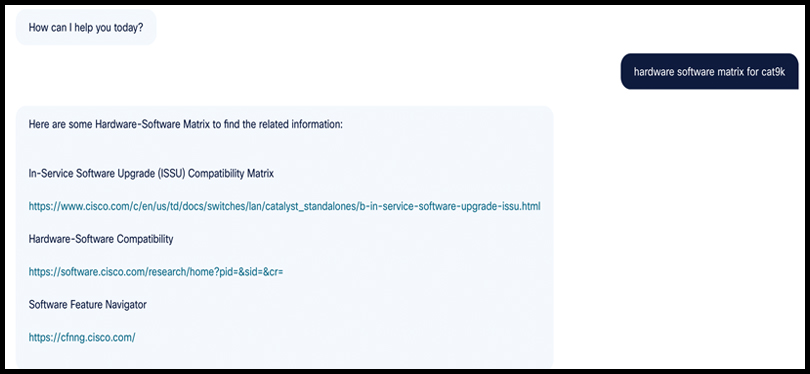 For an example of the cnBOT in action, a request for information about Cisco Catalyst 9000 Series software compatibility generates a link to the matrix shown in Figure 2 and other related links.