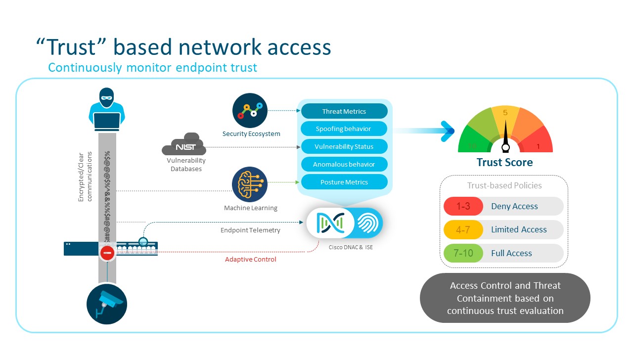 Trust Analytics is part of Cisco SD-Access, Cisco’s best-of-breed Zero Trust solution for the workplace. Trust Analytics detects traffic from endpoints that are exhibiting unusual behavior by pretending to be trusted endpoints using MAC Spoofing, Probe Spoofing, or Man-in-the-Middle techniques.