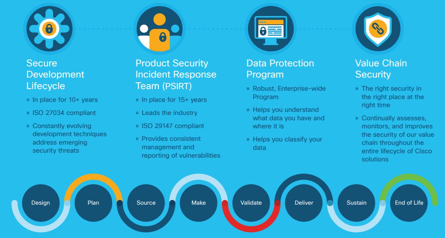 All the processes and capabilities I have described in this post are integrated into Cisco’s hardware and software development processes. Cisco embeds security and resilience throughout the lifecycle of our solutions including design, test, manufacturing, distribution, support, and end of life. We design our solutions with built-in trustworthy technologies to enhance security and provide verification of the authenticity and integrity of Cisco hardware and software. We use a secure development lifecycle to make security a primary design consideration—never an afterthought. And we work with our partner ecosystem to implement a comprehensive Value Chain Security program to mitigate supply chain risks such as counterfeit and taint.