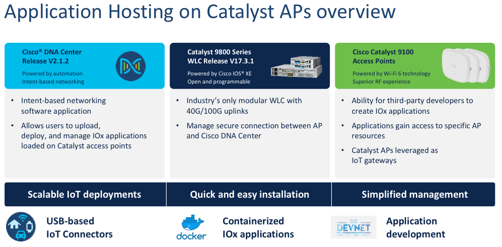 With the 17.3.1 IOS XE release, Cisco introduced the Application Hosting on Access Point feature. In conjunction with Cisco DNA Center support starting from version 2.1.1, Application hosting on Cisco Catalyst 9100 series Access Points enables developers to create and host applications using Docker style container apps. The Cisco Catalyst series Access Points, through their modular capability and IOx framework, facilitate flexibility for third party software and hardware integration.