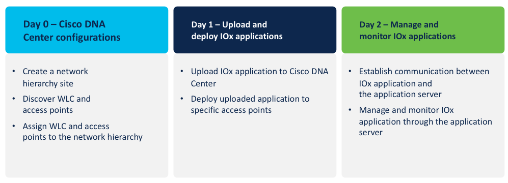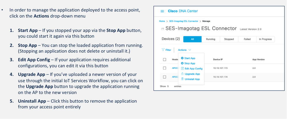 Cisco users can avail of the detailed steps in the following deployment guide to install and deploy a 3rd party IOx app that will be hosted on the Cisco Access Points. Once deployed on the Cisco DNA Center, the application can be managed via the following options highlighted below: