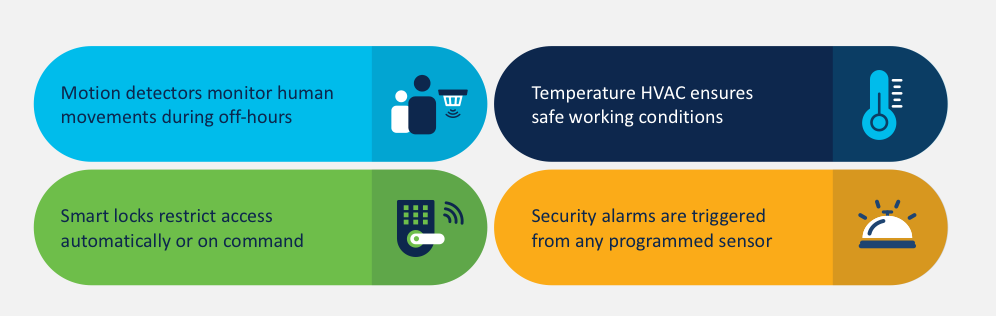 - Building management system (BMS) automation to connect and manage door locks, smart thermostats, lights, and other IoT devices