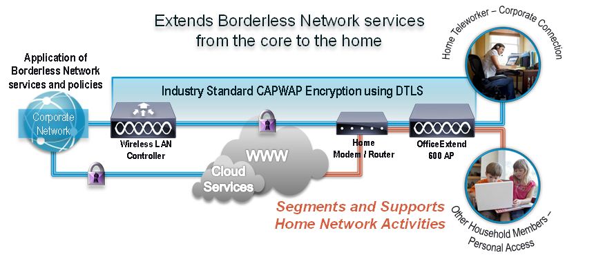 The Cisco OfficeExtend 600 solution helps businesses enable teleworkers by extending wireless and wired access to the corporate network to the workers home or remote office locations. The OfficeExtend solution provides secure access to the corporate network to deliver the same comprehensive access to business services that workers would get in main business office. Additionally, a corporate wired or wireless Cisco IP phone can be added to improve collaboration for teleworkers.