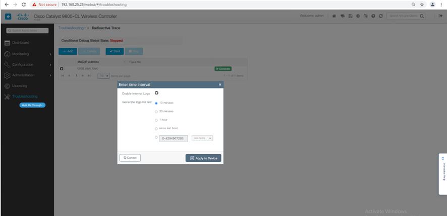 Radioactive-traces needs to be enabled before issue occur and will require we wait for next event to collect the data, behaving like the old “debug client” present in legacy controllers. This will be one “One Stop Shop” to do in-depth troubleshooting for multiple issues, like client related problems, APs, mobility, radius, etc, and avoid having to enable a list of different debug commands for each scenario. By default, it will provide logging level “notice” but the keyword “internal” can be added to provide additional logging level details intended for development to troubleshoot.