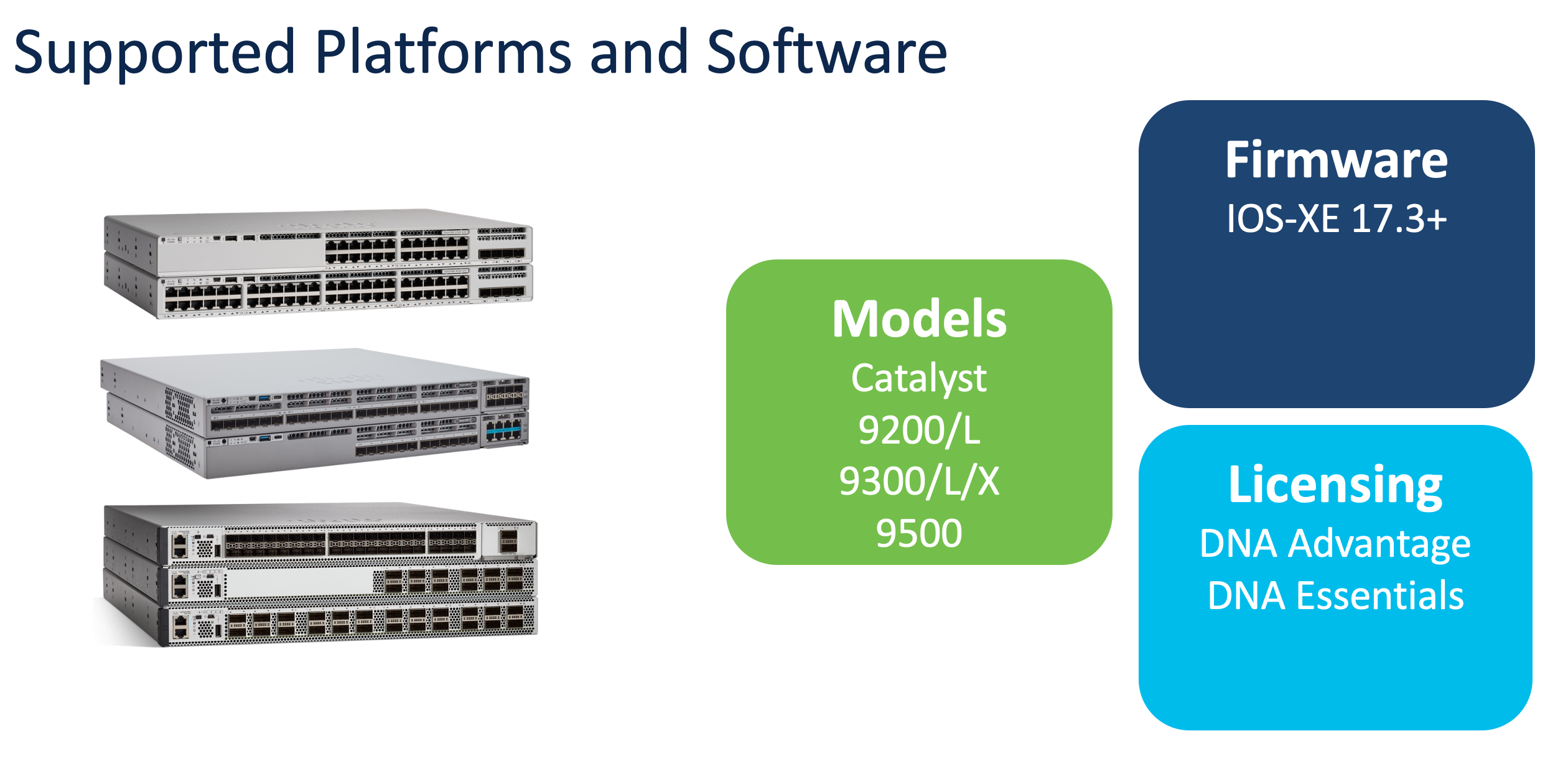 - Current supported switching platforms are Cisco Catalyst 9200, 9300 and 9500 series. Other platforms are under consideration.