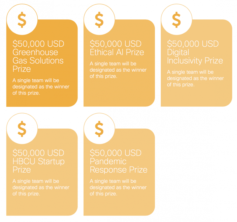 - Historically Black Colleges and Universities (HBCU) Startup Prize. The HBCU Startup Prize will be awarded to a team with at least one founder who is a student or graduate of an HBCU, with an innovative technology solution that addresses a social or environmental problem. This $50,000 USD prize is offered by Cisco’s Employee Resource Organizations (which provide a platform for diverse groups of employees to connect, build powerful new relationships, explore their unique passions and talents, innovate, and excel) and supports our commitment to the strategic recovery, sustainability, and legacy of America’s historically Black colleges and universities.