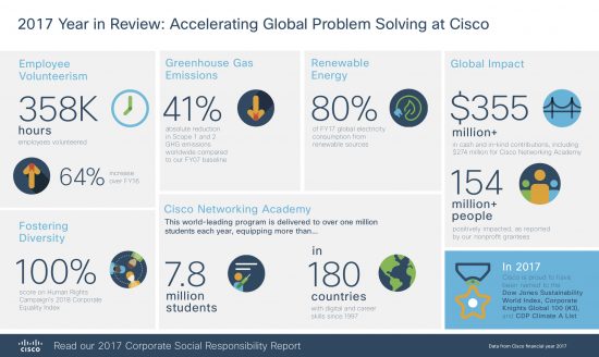 We’re proud of these numbers, but they only tell part of the story. They sit alongside the achievements of Global Problem Solvers—Cisco’s employees, partners, and customers, who are tackling some of the big challenges affecting our industry and society as a whole.