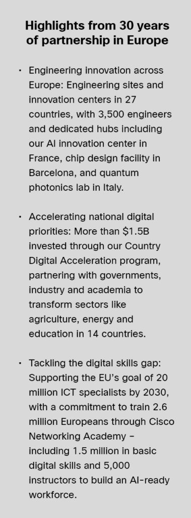 Our long-standing partnership shows what’s possible when shared values meet deep engineering capability. Cisco and Europe have the vision, talent, technological and scientific excellence to help businesses across the continent – and around the world – responsibly compete in the AI-powered future.
