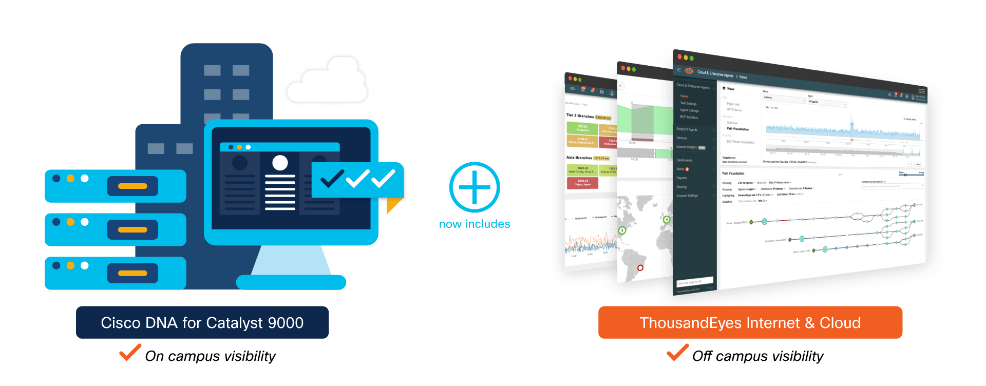 Now, with the flick of a switch, customers can enable ThousandEyes on their Catalyst 9300 and 9400 switches. Delivering immediate visibility from the campus to critical SaaS and internal apps and across the WAN with zero deployment. Moreover, DNA Advantage and Premier customers will now be able to run the ThousandEyes agent natively on their Catalyst 9300/9400 switches and will receive access to ThousandEyes Internet and cloud intelligence at no additional cost. See the full details: ThousandEyes Announces Integration with Cisco Catalyst 9000 Access Switching Series.