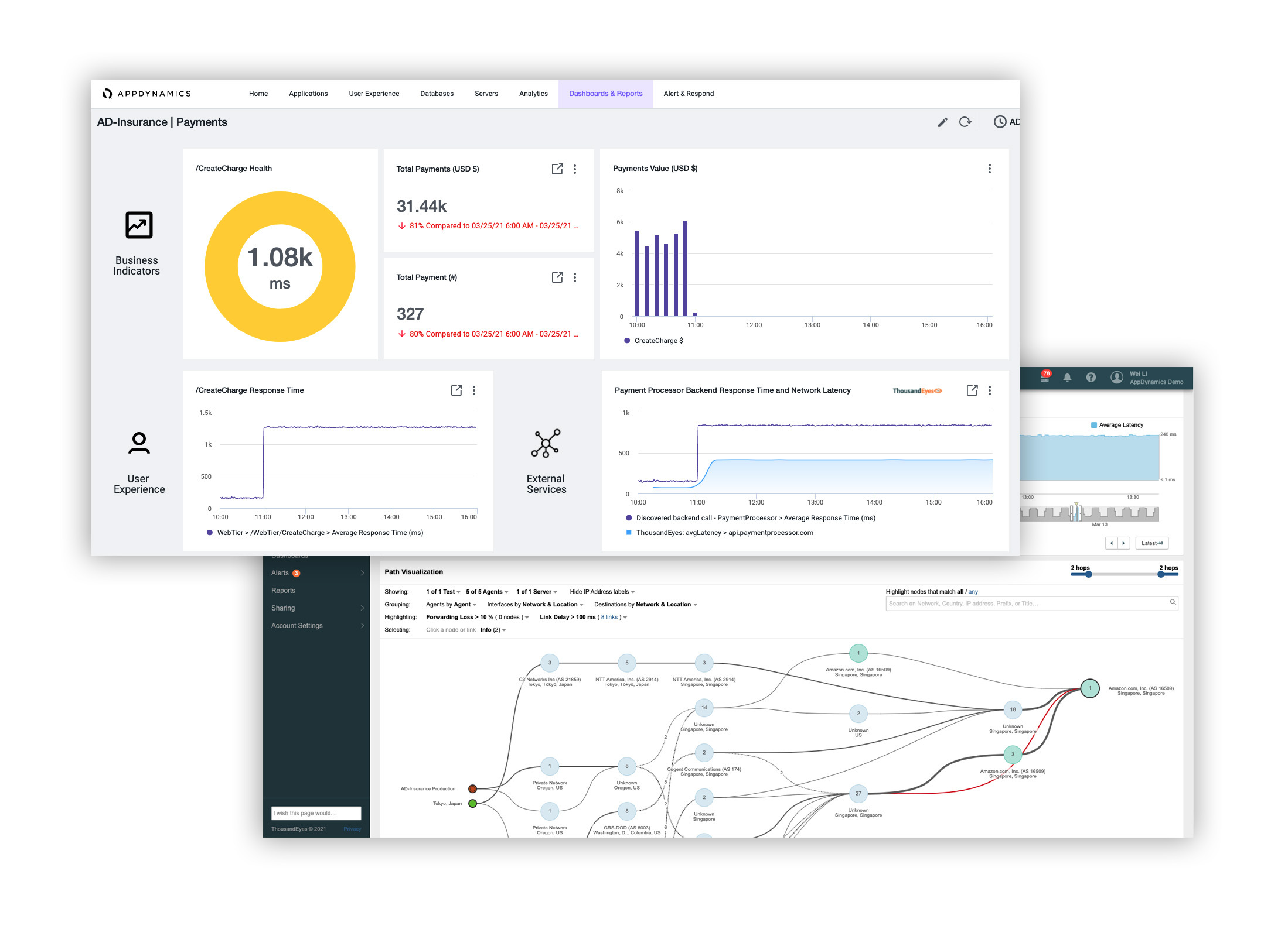 Today, we’re announcing an integration of ThousandEyes Internet and cloud intelligence data in AppDynamics Dash Studio, AppDynamics’ next-gen dashboarding experience. This integration will be incredibly valuable to our customers as the first enterprise-wide full stack observability offering, bringing the previously siloed business, application, and network teams together with a common operating language to accelerate MTTR from the app through the network and infrastructure. This single pane of glass provides an integrated dashboard to quickly isolate what is impacting end-user experience when issues arise. Even better, with seamless navigation between AppDynamics and ThousandEyes, the operations teams can drill down across the stack, maintaining context from the app to the network. If you also agree the app *is* the business… be sure to check out the AppDynamics blog on this news to learn more.
