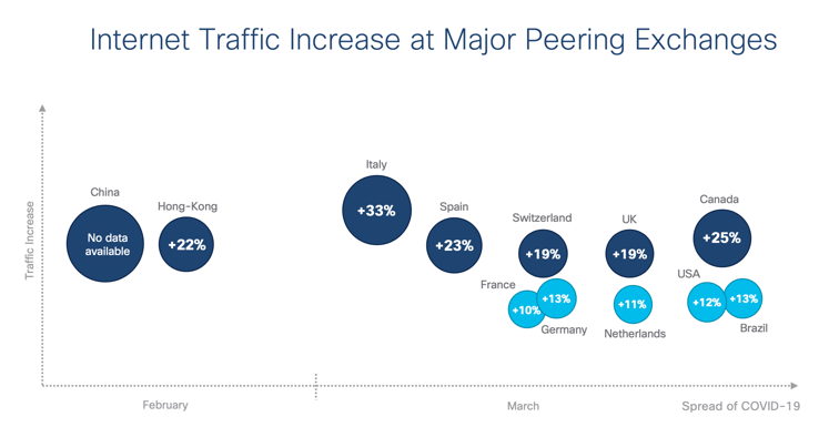 Shouldering the weight of these new digital experiences, service provider and cloud provider networks are experiencing a significant increase in traffic. Last week, in response to a request from the European Union, entertainment streaming service companies ‘turned down’ their video quality to lower bandwidth constraints. Netflix managed to reduce traffic load by 25% starting with Italy and Spain, which had experienced the largest spikes in traffic.