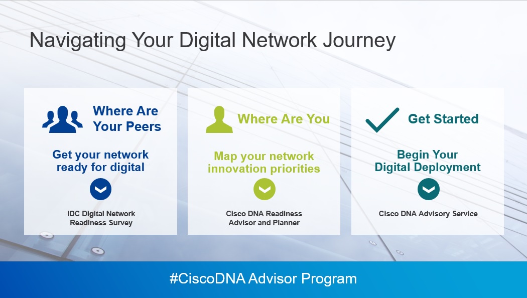 The DNA Advisor Program consists of a framework and tools created to ease your transition to a “self-driving” network that is continuously aligned to the business. The best part is that you can learn a lot about your digital network readiness within just a few minutes, using the on-line self-assessment. Then, as you are ready, you can engage the right Cisco and partner resources to take the next steps.