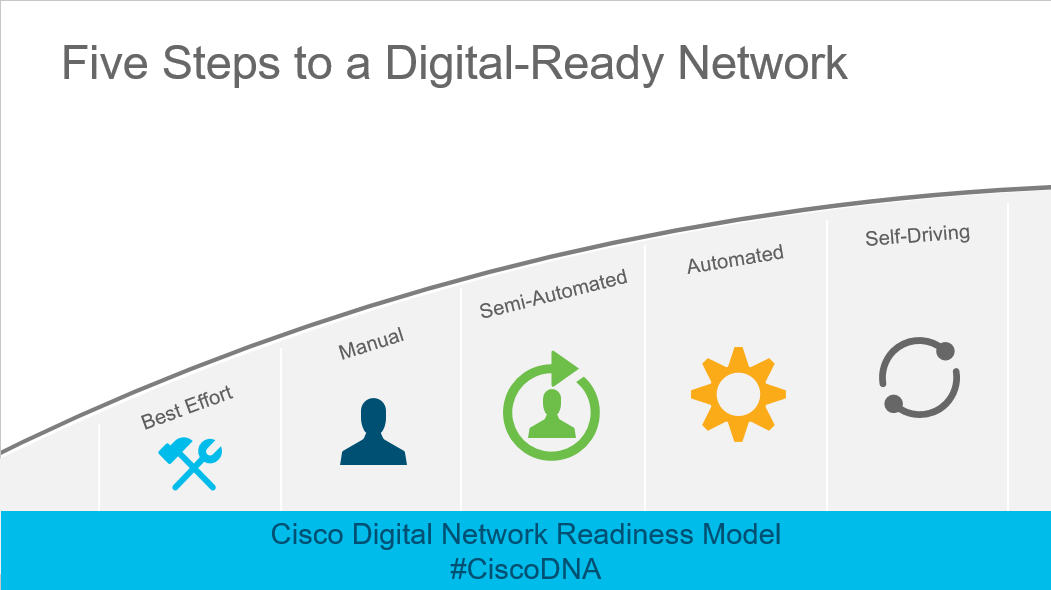 1. Cisco Digital Network Readiness Model – this 5-stage maturity model that maps the evolution across architecture, automation, security, service assurance and analytics towards a “self-driving” network constantly aligned to business needs.