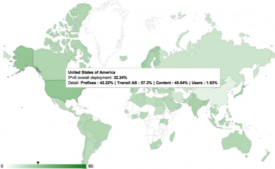 To get a better idea of how each individual piece of the deployment puzzle is advancing, Cisco has been tracking various leading indicators and regional deployment statistics. We’ve pulled these together in an interactive tool at 6lab.cisco.com where you can view IPv6 deployment data from a variety of perspectives. With the tool you can “mouse over” different regions of the world to see how various countries are doing in different areas. For example, by moving your mouse cursor over the United States, you can see that 57% of the networks that appear as transit for IPv4 today also support IPv6, end users as measured by Google is higher than the global average at 1.93%, and that 45% of the time the average user in the US visits an IPv6 reachable website. You can also dig down into the methodology we are using to create the various rankings and percentages.
