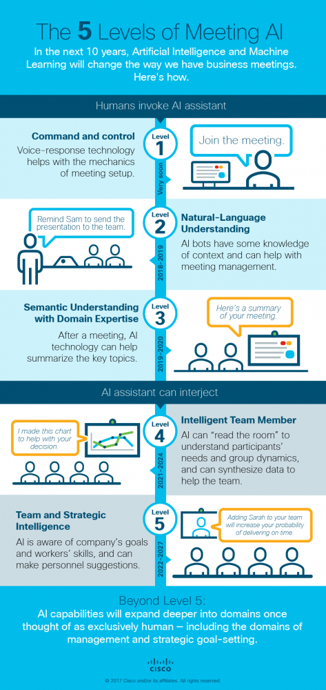 Over at Medium, I propose that there are 5 Levels of Meeting AI, starting with simple command-and-control bots that can perform the mechanics of joining meetings for us. The growth of machine intelligence and its capability to understand human and business intention will eventually lead to the development of smart AI team members who will be able to proactively advise teams and people on how to build powerful and robust new businesses opportunities.