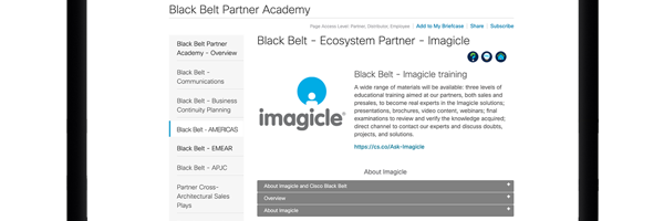 Leveraging the Black Belt Academy, Cisco and ecosystem partner Imagicle created a virtual course that enables partners to expand their knowledge of the joint Cisco and Imagicle value proposition. This course helps partners further differentiate their UCM Cloud offer in the market, ultimately paving the way to increased sales of this joint solution.