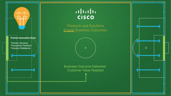 If we equate the goal (see diagram below) with delivering on business outcomes and realized value for our customers, we as Cisco only really play in the midfield of the soccer pitch. While our (predominantly) horizontal solutions are important components that enable business outcomes we NEED our partners (all of them) and their services to get to the goal. Cisco can’t do this by ourselves and it presents a critical opportunity for our Partners to innovate with services, industry approaches, and/or ISV integration to accelerate the delivery of business outcomes. In addition, this gives them the opportunity to differentiate themselves (and Cisco in the process). It’s up to our partners to innovate in the penalty area as this is how we get to the goal!