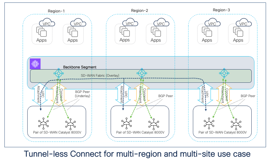 In a site-to-site use case, a backbone segment is created. The connect attachment uses the underlying VPC attachment for data transport and is associated with this backbone segment on the CNE. All the Catalyst 8000V devices in a CGW in any region will receive the routes advertised by other 8000V devices for underlay reachability. The Cloud WAN core network thus acts as a high-speed global middle-mile to the SD-WAN tunnels overlay network. This inner working is hidden from the customer as Cloud OnRamp automation takes care of the end-to-end configuration.