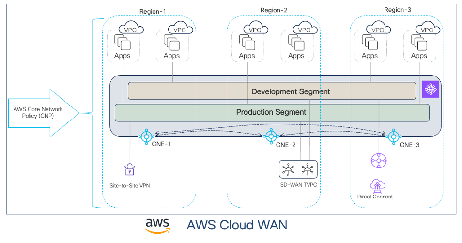 AWS Cloud WAN is a managed wide area network (WAN) service that enables customers to easily connect their workloads, users, and enterprise network over the AWS global network. AWS Cloud WAN network is managed via a central core network policy (CNP) document which contains information about regions, segments, attachments, route-sharing, and service insertion. A global Cloud WAN network is deployed based on the intent declared in the CNP.