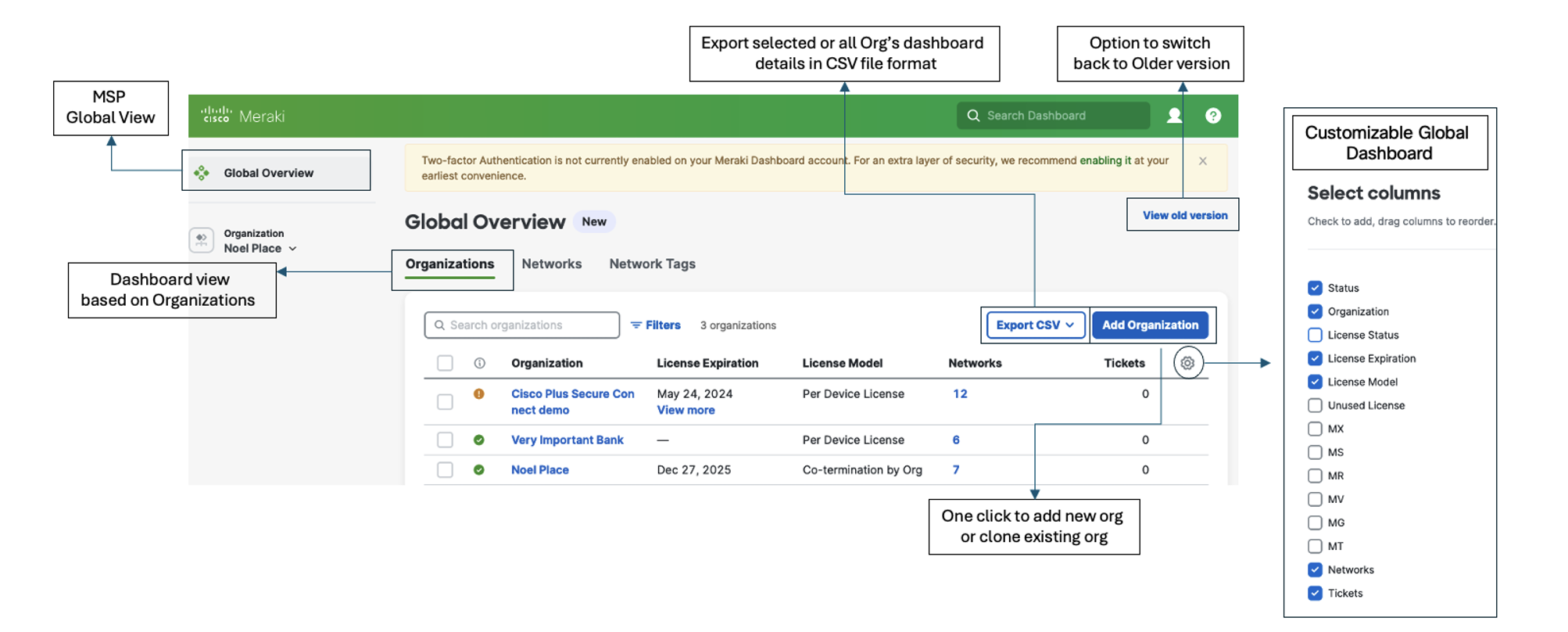 The Global Overview Page, replacing the older “MSP portal page” and offering a summary view of all customer environments. This allows MSP admins to manage multiple organizations with a single login, while still maintaining customer privacy as each organization’s licensing, inventory, users, and configurations are treated independently. The global dashboard is customizable to select and display the required columns. Also the view can change based on “Organisations”, “ Networks” or “Network Tags”.