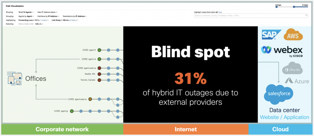 To address this challenge, Cisco ThousandEyes provides an entirely new category of application, essentially providing visibility into the Internet. And so even though you don’t own and control the Internet or cloud provider networks, with ThousandEyes you gain visibility into them as if you do.