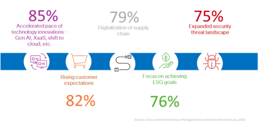 The top 5 ranked priorities for managed services indicate a shift in focus: accelerating innovation (85%), enhancing customer experiences (82%), optimizing supply chains (79%), achieving sustainability goals (76%), and managing risk and compliance (75%). It’s no longer just about supporting IT back-office functions; it’s about driving the business strategy forward and enabling a more agile organization.