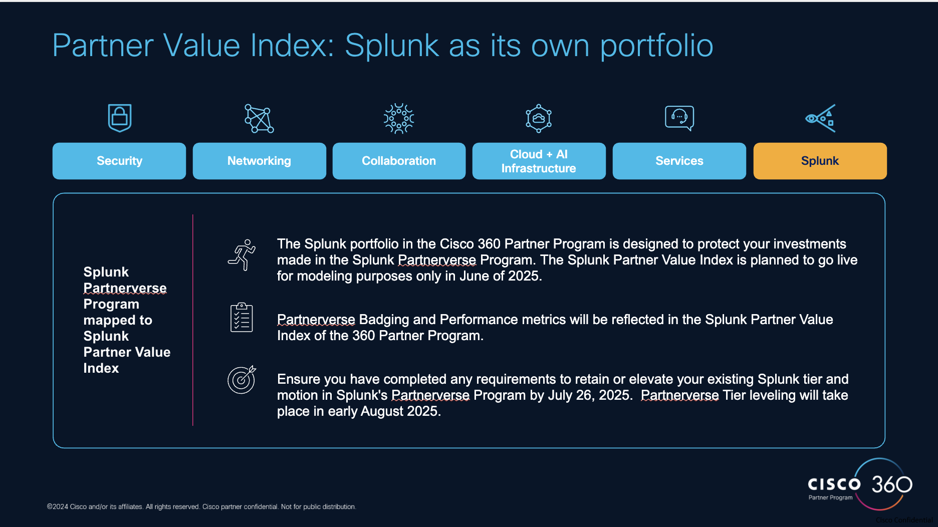 We anticipate releasing the preview of the Splunk Partner Value Index in June. Partnerverse Badging will continue to be a key element in our transition of the Partnerverse Program into Cisco 360 protecting your investments in Partnerverse. To ensure a smooth transition to Cisco 360, it is important to note that Splunk will be conducting its tier leveling process in early August and therefore to retain your current benefits including discounting during the transition ensure you have completed any remaining requirements to retain your Tier and Motion in Splunk Partnerverse by July 26, 2025.