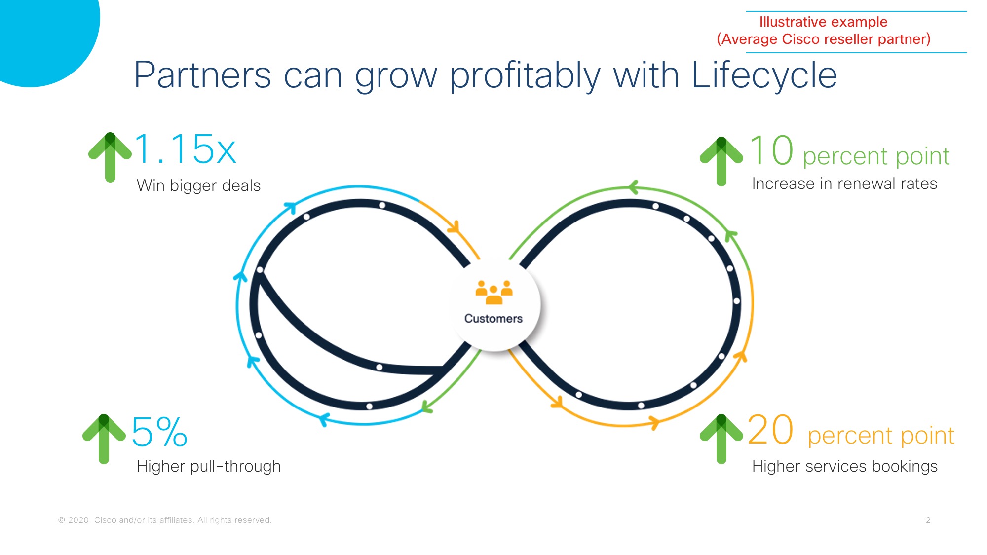 According to Cisco’s own research, by adopting the lifecycle selling framework, as shown in Figure 2, partners on average can expect to see a 1.15X increase in deal size, a 20 percent point increase in partner service pull-through, a 10 percent increase in renewal rates, and a 5 percent higher pull-through. Ultimately, this leads to increased partner revenues.