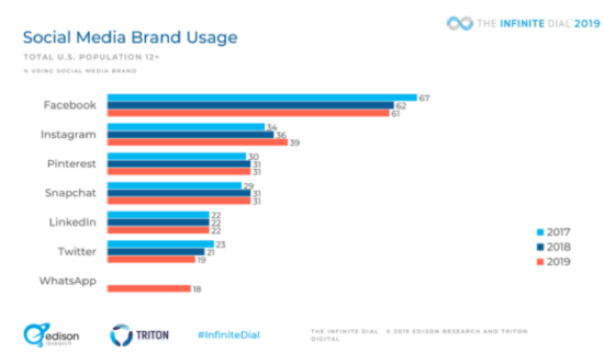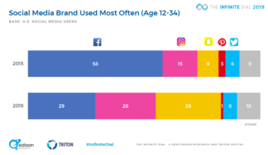 The Infinite Dial showed a slight uptick in overall social media usage, however, the number of Americans using social media has essentially remained unchanged since 2016. At this point, the number of people who use social media is flat. It appears that we’ve hit peak social. The last big year of social media growth was 2016.