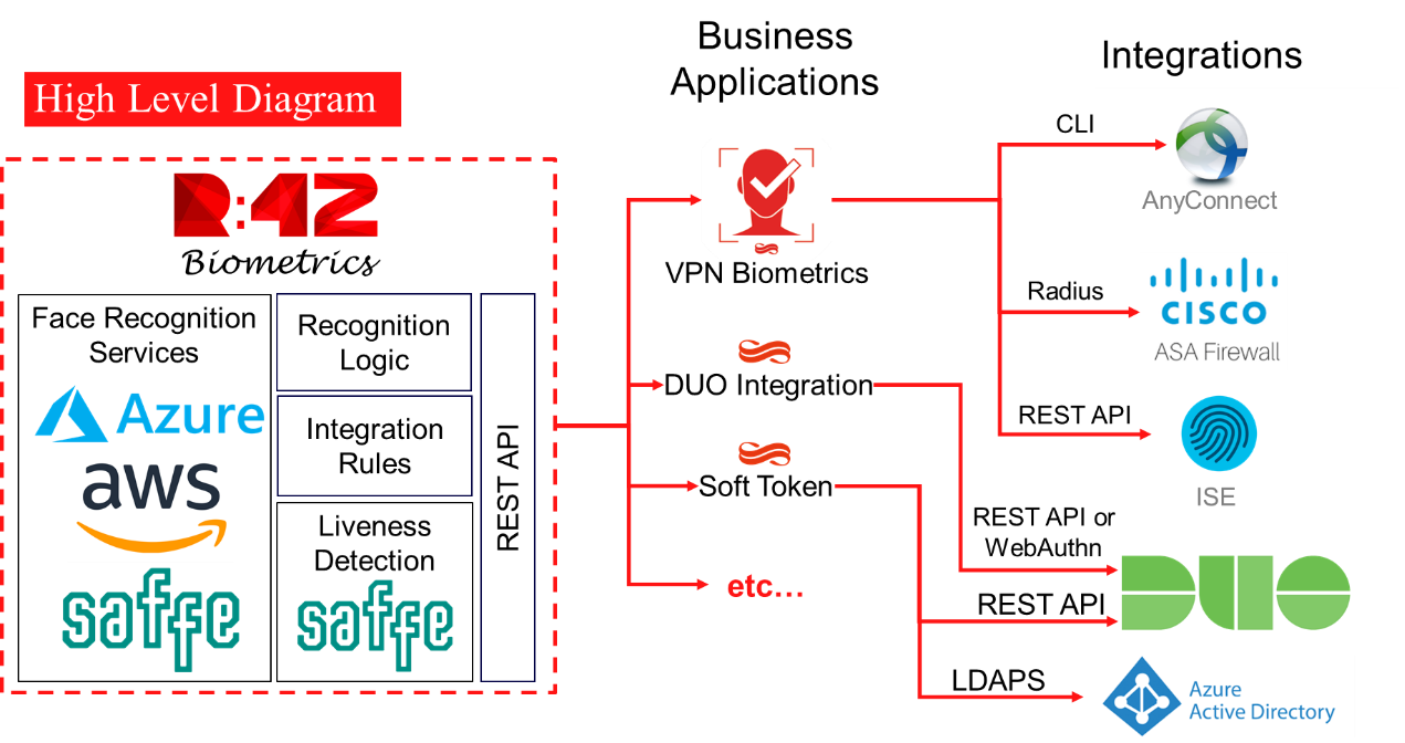 R42 Biometrics is natively integrated with Cisco security technologies—AnyConnect, ASA, and ISE—through APIs (as shown in Figure 4), providing a seamless and secure end-user experience. Integration with Cisco DUO as an optional layer of authentication is also available. We have created a universal solution for remote work; VPN; virtual desktop, enterprise, and cloud applications authentication mechanisms.