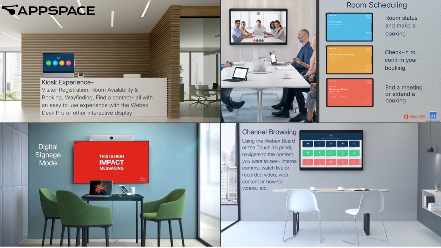 Space reservation and occupancy status also become much easier to administer using a Webex Navigator touch device running the Appspace app outside a meeting room. And if the meeting room is equipped with a Cisco Webex Room Kit, the Appspace app can provide critical information such as compliance with occupancy guidelines, availability of other rooms if occupancy exceeds guidelines, relevant company information, and even room air quality.