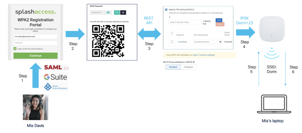 Step 5. Connect Device: Mia uses the PSK generated in Step 2 to connect her laptop to the SSID named “Dorm.”