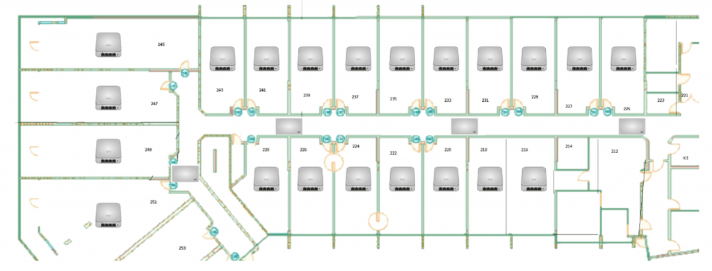 This more cost-effective approach involves installing APs to cover multiple rooms, typically in a zig-zag pattern. This design supports most use cases while reducing the number of required APs. Set transmit power to medium and configure a moderate bitrate. Again, use Auto Channel and Auto Transmit power settings for optimal performance and include hallway-based APs for seamless roaming.