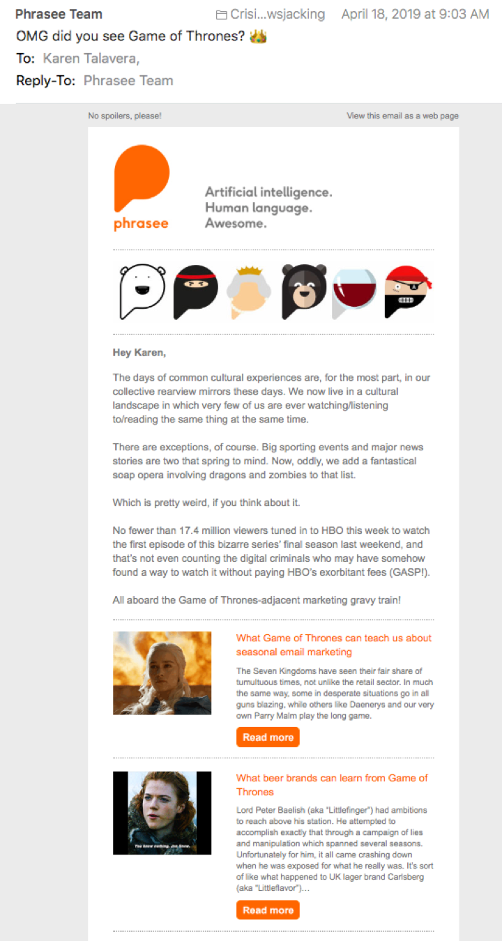Once upon a time, B2B marketing became synonymous with “boring” while B2C marketing was allowed to be edgy, creative and fun. I say no more! B2B email can be just as personality-driven as B2C, and is more memorable and welcomed when it is. Take Phrasee for example (a language optimization AI company). They have a distinct brand personality and tone unmistakable in every one of their weekly email newsletters, down to the emojis in subject lines. If your brand or company has a unique personality – or is known for the personality of your founder (think Steve Jobs and Apple) – your email should be letting it shine. In fact, we need more B2B email with personality and style like this one:
