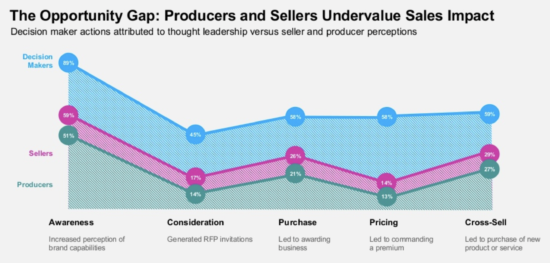 Here’s a chart that sums it all up: At every stage, decision makers value thought leadership more than those who produce it.