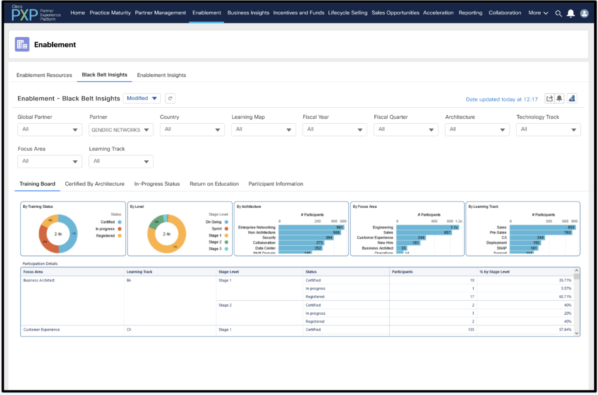 - Sharing Insights: After creating these dashboards, we share the enablement insights with our stakeholders. Partners and Distributors access these insights via the PXP tool, where they can track participant details on the status of Black Belt trainings and certifications which are available from the Participant Information Tab under the Black Belt insights section within Enablement, and identify the areas for improvement. These dashboards enable us to support our Partners and Distributors more effectively and align internal strategies with external needs.