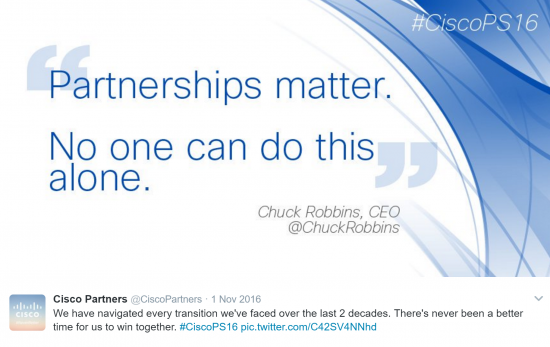 "We must enter this market together" – without our partners, we cannot succeed! – @ChrisDedicoat, EVP for Worldwide Sales #CiscoPS16 pic.twitter.com/LCgb6X2Cdy