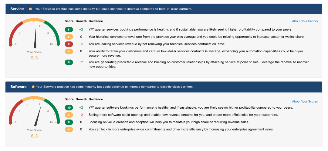 Practice Maturity provides a maturity score, the factors driving it, and recommended actions to close gaps across Service, Software, Profitability, Automation, and Lifecycle practice areas. A partner’s score provides a quick vision of how prepared their business is to take on opportunities. We offer this as part of a journey to provide dashboards covering a top-line overview, performance, aggregate results, and detailed reports. Double-clicking can reveal additional insights and trends such as bookings growth, recurring activities, resale and adoption focus, moving to auto quoting in commerce and digital campaigns, and converting software subscriptions to EAs.