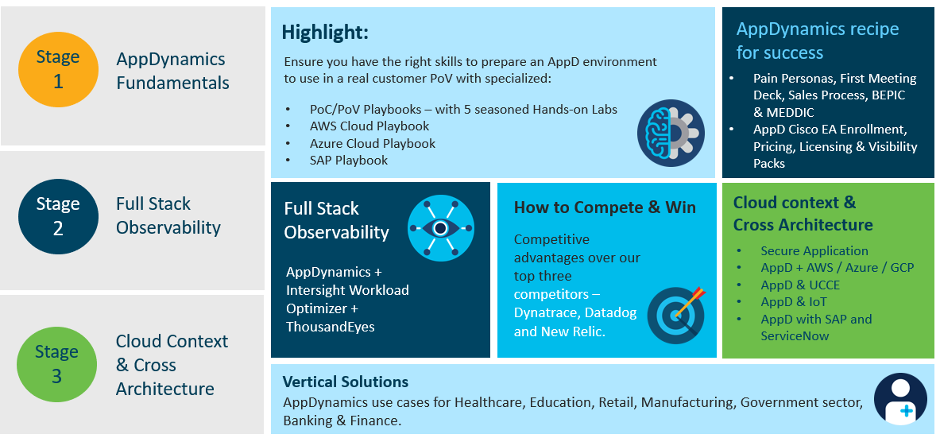 The revised strategy for Partner enablement on AppDynamics, embarks by powering our partners with in-depth knowledge on the APM Platform, beginning with the evolution of the business application and how they can help their customers manage the modern applications. As they gradually gain ground, we equip them with hands-on specialized labs to ensure that they have the right skills to prepare an AppDynamics environment to use in a real customer scenario. Once, they are well versed with all the know-hows of the solution, we then press forward on “Full Stack Observability” and demystify the potential of Intersight Workload Optimizer and ThousandEyes in delivering that flawless application visibility together with AppDynamics. In the end, we divulge our partners to “Cross Architecture” concepts and the world of Cloud, emphasizing on how AppDynamics associates with other architectures and some of the top Cloud service providers.