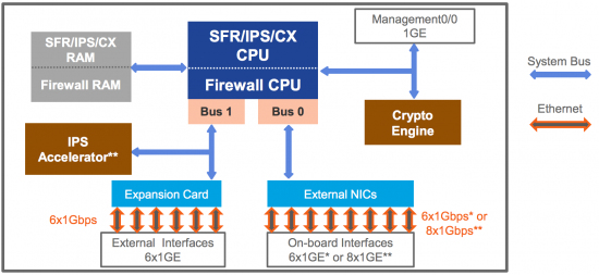 You should make a note of the placement of the NPU and compare it to the ASA5512-X to ASA5555-X platform. The NPU on this platform is doing most crypto tasks for IPSec and SSL VPN, just like the crypto engine used to do without the limitation of a system bus connecting the external NICs.
