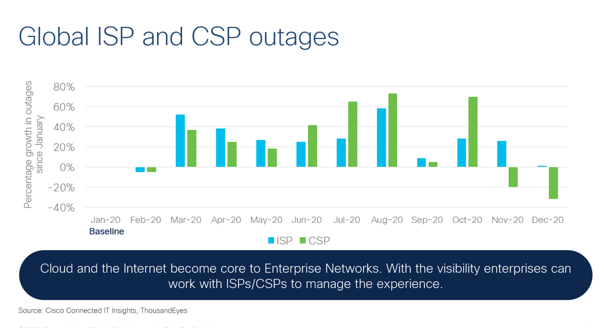 As work-from-home users who would typically connect through a WAN now relied on the Internet, ISPs and CSPs (cloud service providers) also felt the strain. Rallying to cope with a different, and new, user distribution, transit and Internet Service Providers (ISPs) were forced to undertake more traffic engineering, adding, moving and reconfiguring their network resources – leading to several ISP outages. CSPs too experienced increased usage of their services as enterprises worked to accommodate a distributed, remote workforce. However, CSP outage baseline was much smaller relative to ISPs, highlighting more of an agile deployment model. Since most of these outages were managed, they took place “outside of business hours” so as to cause as little inconvenience as possible. Nonetheless, the importance of IT teams having visibility and insights into Internet and cloud provider networks cannot be overstated. It ensures an optimal experience for their user base whether in collaboration with ISPs or cloud providers, or through increased provisioning of their own applications.