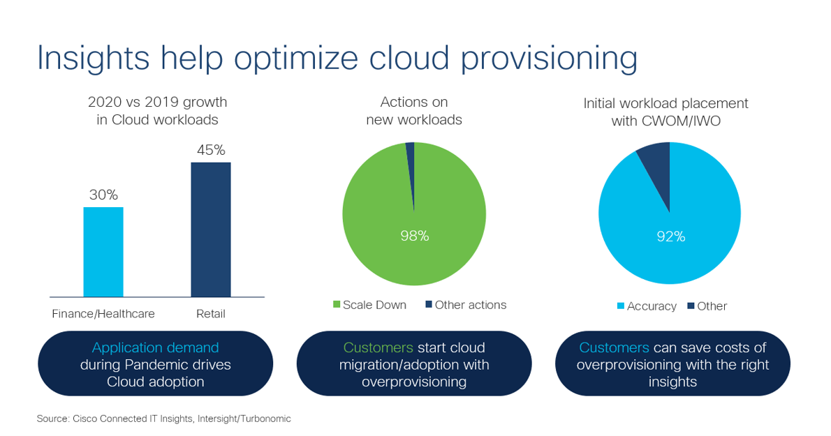 Another driver of cloud adoption during the pandemic was the increase in application demand. According to Turbonomic, there was a 30% to 45% increase — depending on the industry vertical — in new cloud workloads deployed. But despite the rise in cloud adoption, the vast majority of actions on the new workloads — 98% — were scaled down. This was due to customers’ tendency to overprovision initially when moving into cloud — an issue that can be addressed using tools such as Cisco Workload Optimization Manager (CWOM) and Intersight Workload Optimizer (IWO). When these tools are used for initial workload placement, 92% of new workloads are placed accurately.